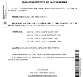 El SACYL ha organizado una nueva campaña de vacunación COVID-19 en Béjar para el día 21 de abril para las personas nacidas en los años...