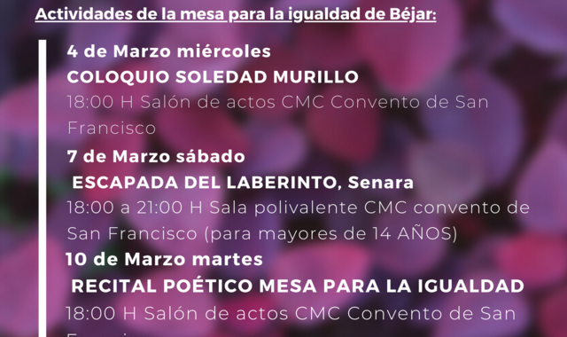 La concejalía de Igualdad del Ayuntamiento de Béjar organiza y colabora en una serie de actos con motivo de la conmemoración del 8 de marzo de 2020.