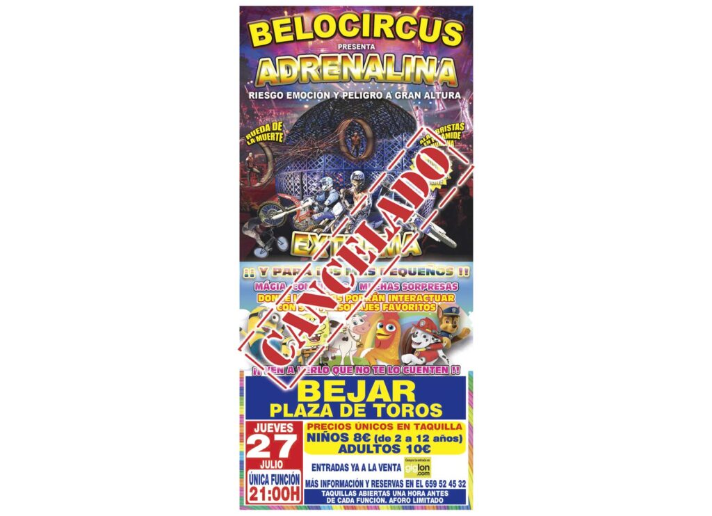 Por motivos totalmente ajenos al Ayuntamiento de Béjar, el Circo “BELOCIRCUS” que tenía programada su única actuación, “ADRENALINA”, para el día 27 de Julio en Béjar, ha sido cancelada. Disculpen las molestias.