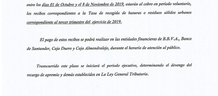 Durante el periodo comprendido entre los días 1 de octubre y 8 de noviembre estarán al cobro en periodo voluntario los recibos correspondientes a la Tasa de recogida de basuras o residuos sólidos urbanos correspondientes al tercer trimestre del ejercicio de 2019.