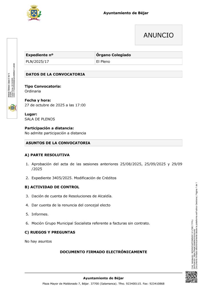 El Ayuntamiento de Béjar celebrará la sesión plenaria correspondiente a este mes de octubre el próximo lunes día 27 de octubre, a las 17:00h con los siguientes asuntos: