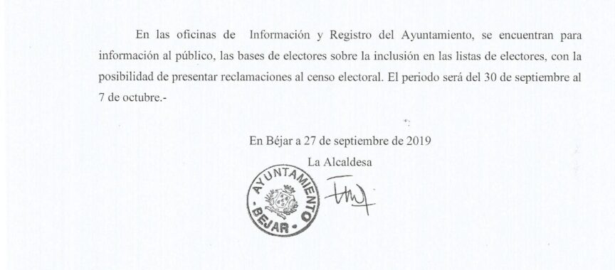 En la Oficina de Información y Registro del Ayuntamiento de Béjar, se encuentran para información al público, las bases de electores sobre la inclusión en las listas de electores, con la posibilidad de presentar reclamaciones al censo electoral. El periodo será del 30 de septiembre al 7 de octubre.