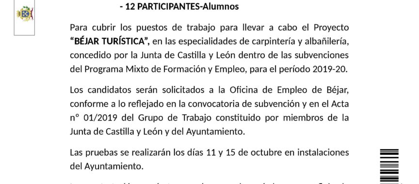 Para cubrir los puestos de trabajo para llevar a cabo el Proyecto “BÉJAR TURÍSTICA”, en las especialidades de carpintería y albañilería, concedido por la Junta de Castilla y León dentro de las subvenciones del Programa Mixto de Formación y Empleo, para el período 2019-20.