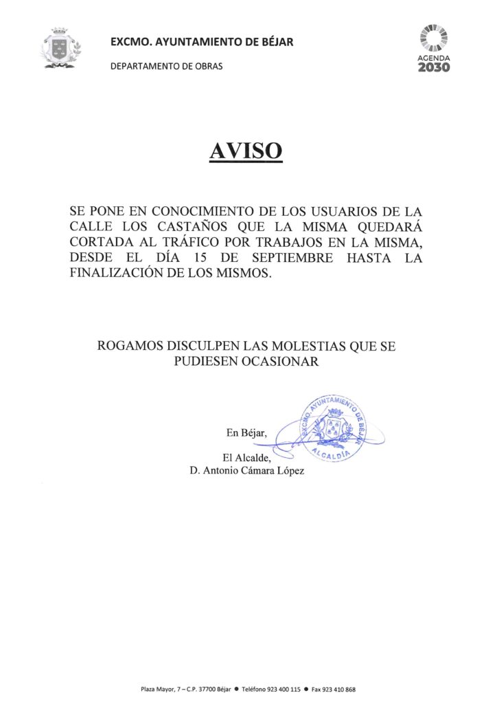 El Ayuntamiento de Béjar informa que la calle Los Castaños permanecerá cortada al tráfico desde el próximo lunes, 15 de septiembre, y hasta la finalización de los trabajos de renovación de las canalizaciones de saneamiento.