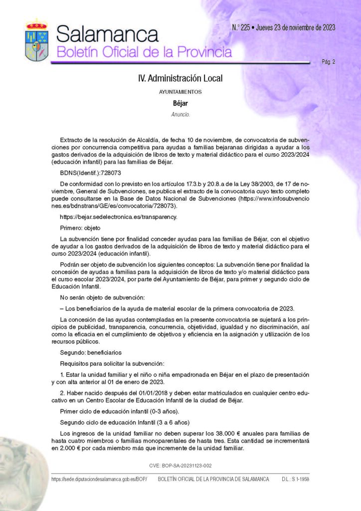 La concejalía de Servicios Sociales informa de la apertura de plazo para la convocatoria de subvenciones para ayudas a familias bejaranas dirigidas a ayudar a los gastos derivados de la adquisición de libros de texto y material didáctico para el curso 2023/2024 en educación infantil.