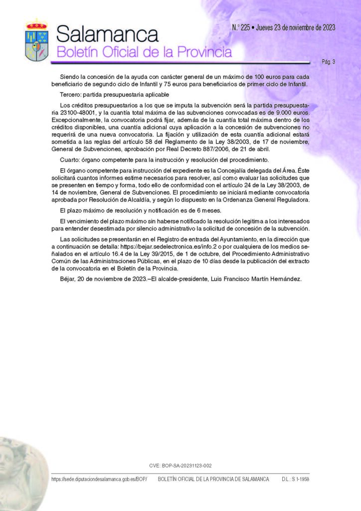 Este viernes, 24 de noviembre comienza el plazo para la solicitud de dichas ayudas. Las solicitudes se presentarán en el Registro de entrada del Ayuntamiento, o a través de la sede electrónica del Ayuntamiento de Béjar con un plazo de 10 días.