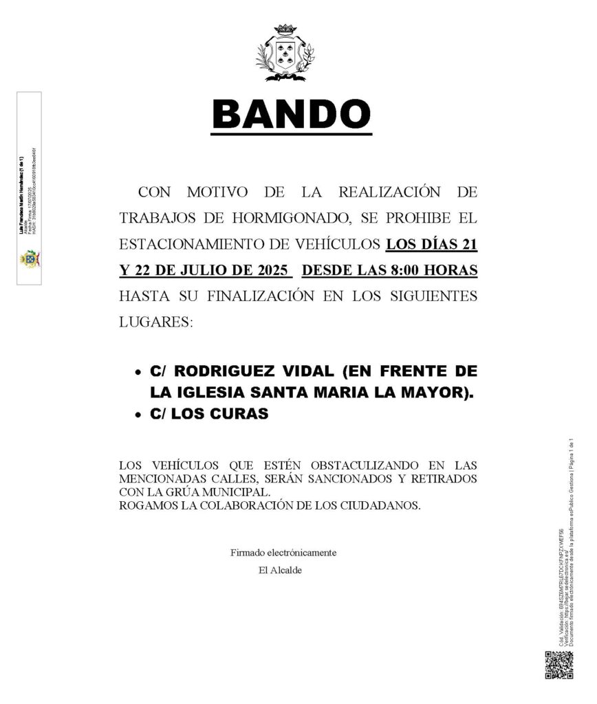 Con motivo de la realización de trabajos de hormigonado, se prohíbe el estacionamiento de vehículos los días 21 y 22 de julio de 2025 desde las 8:00 horas hasta su finalización en los siguientes lugares: