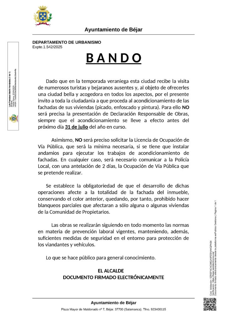 Dado que en la temporada veraniega esta ciudad recibe la visita de numerosos turistas y bejaranos ausentes y, al objeto de ofrecerles una ciudad bella y acogedora en todos los aspectos, por el presente invito a toda la ciudadanía a que proceda al acondicionamiento de las fachadas de sus viviendas (picado, enfoscado y pintura). Para ello NO será precisa la presentación de Declaración Responsable de Obras, siempre que el acondicionamiento se lleve a efecto antes del próximo día 31 de julio del año en curso.