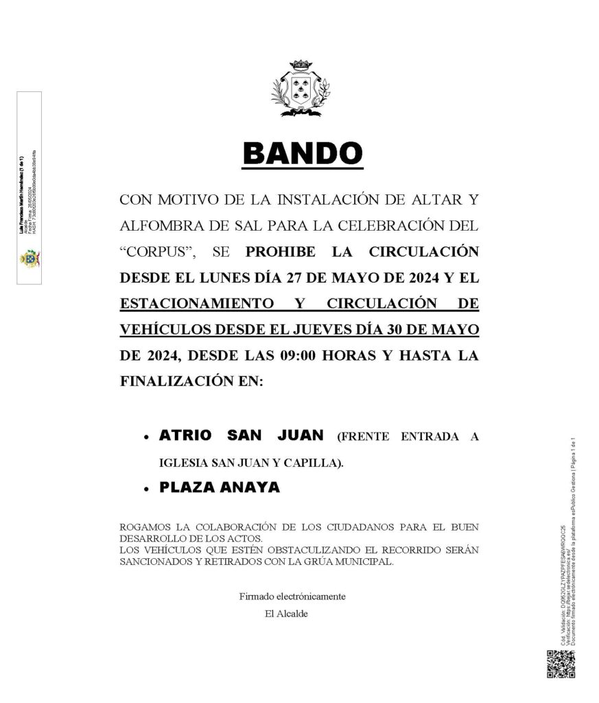 Estas son las restricciones de circulación y aparcamiento con motivo de la instalación del Altar y elaboración de la alfombra de sal en San Juan y Plaza de Anaya