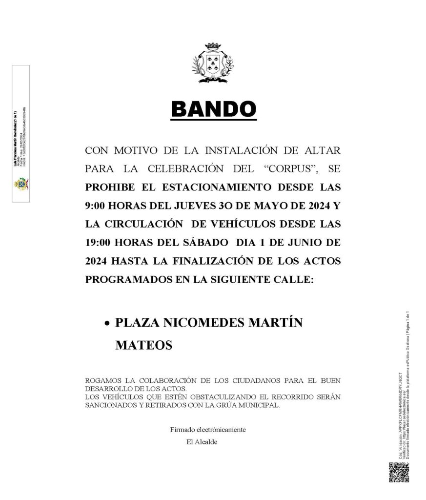 Estas son las restricciones de circulación y aparcamiento con motivo de la instalación de un Altar en Nicomedes Martín Mateos