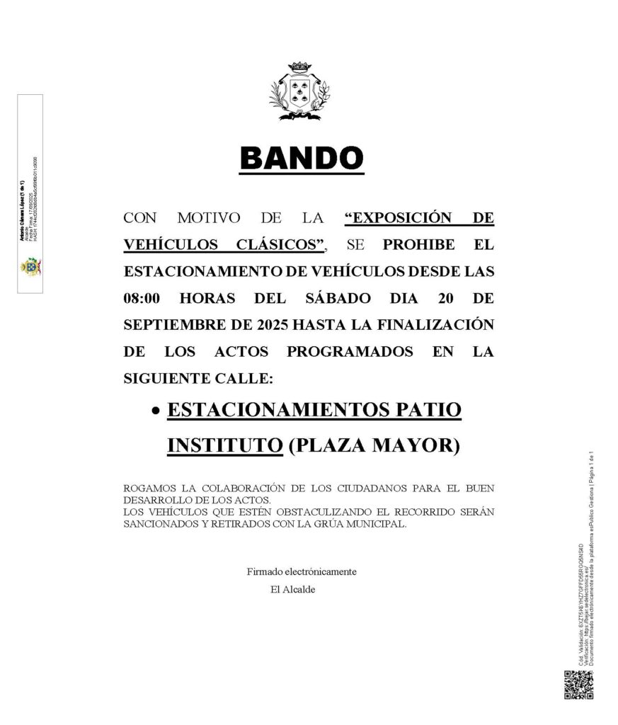 Con motivo de la “Exposición de Vehículos Clásicos”, se prohíbe el estacionamiento de vehículos desde las 08:00 horas del sábado día 20 de septiembre de 2025 hasta la finalización de los actos programados en la siguiente calle: