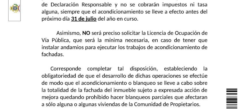 Asimismo, NO será preciso solicitar la Licencia de Ocupación de Vía Pública, que será la mínima necesaria, en caso de tener que instalar andamios para ejecutar los trabajos de acondicionamiento de fachadas.