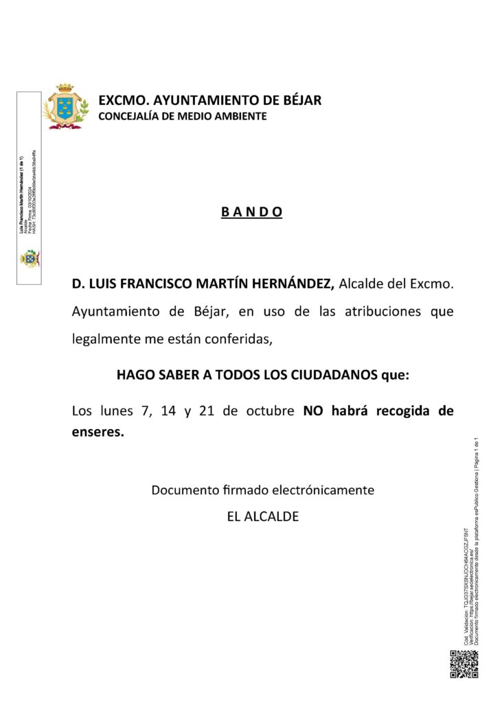 D. LUIS FRANCISCO MARTÍN HERNÁNDEZ, Alcalde del Excmo. Ayuntamiento de Béjar, en uso de las atribuciones que legalmente me están conferidas, HAGO SABER A TODOS LOS CIUDADANOS que: