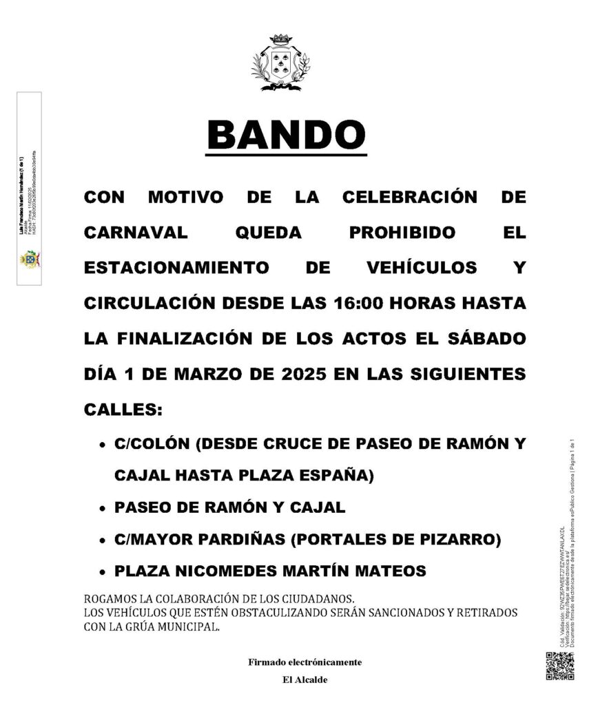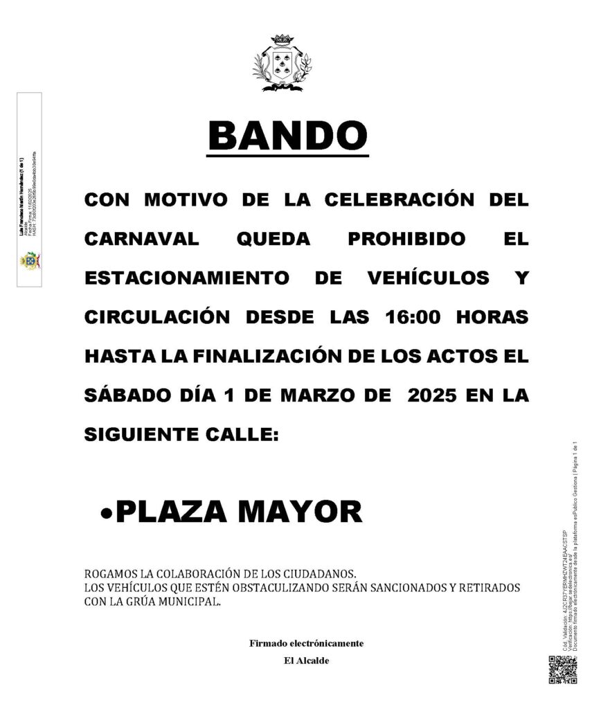 El Ayuntamiento de Béjar pone en conocimiento de los vecinos y visitantes las restricciones de aparcamiento y circulación que tendrán lugar el próximo sábado, 1 de marzo, con motivo de la celebración del desfile de peñas y el Carnaval: