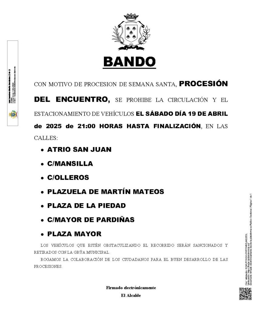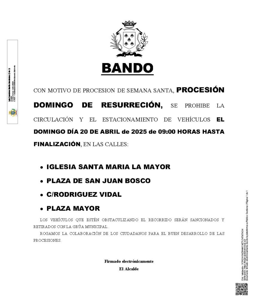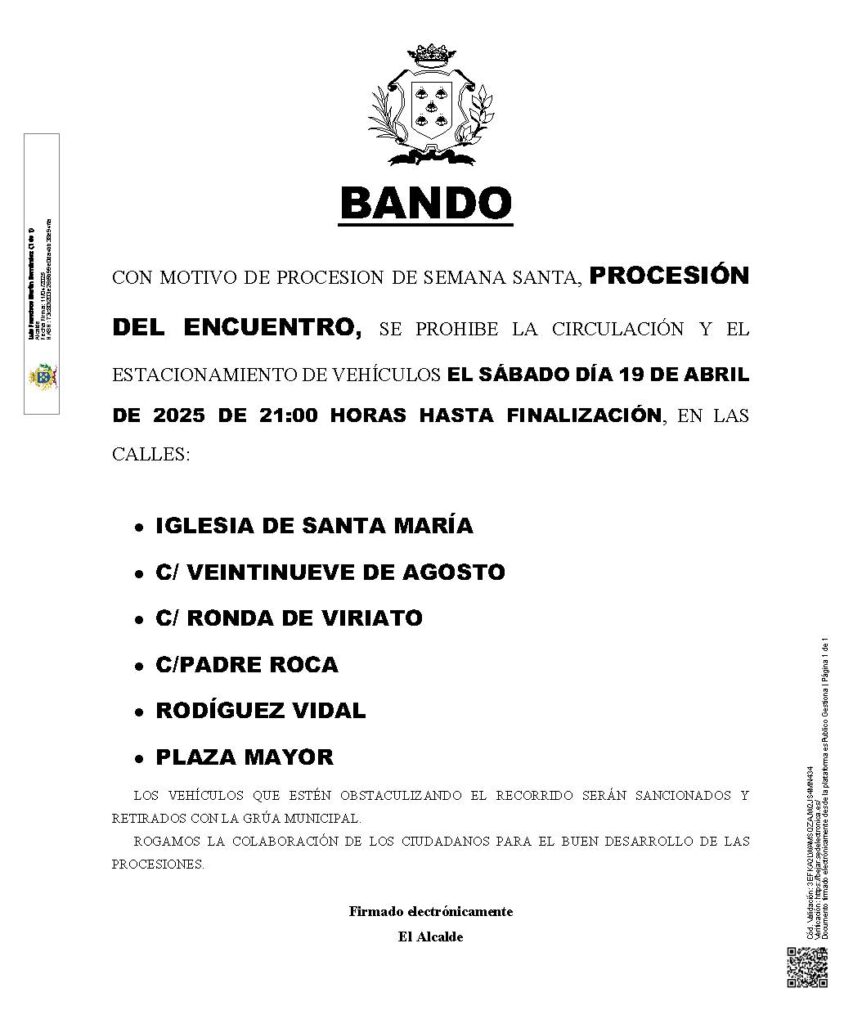 Bandos que regulan el aparcamiento y circulación para el sábado y domingo santo.