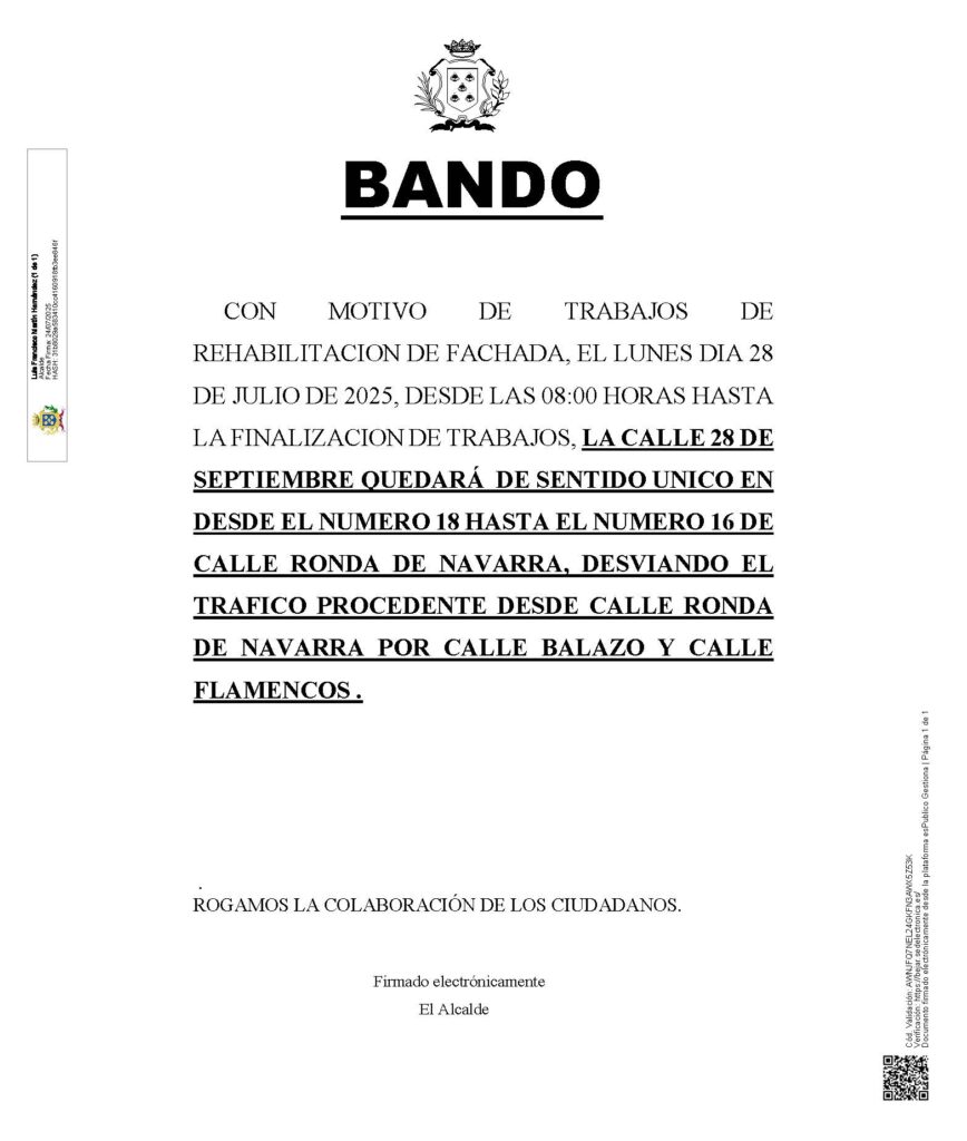 Con motivo de trabajos de rehabilitación de fachada se emiten los siguientes bandos: