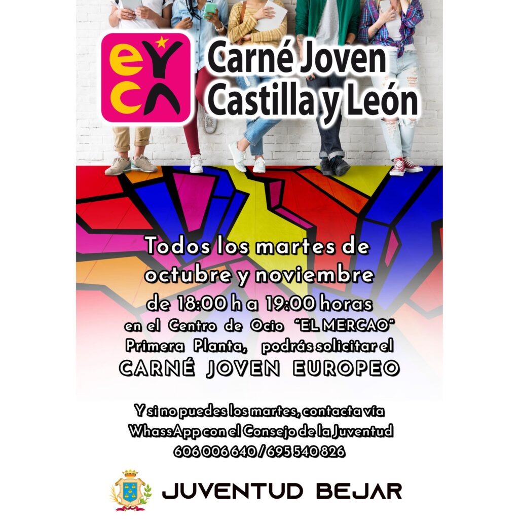Todos los martes de octubre y noviembre de 18:00 h a 19:00 horas en el Centro de Ocio “EL MERCAO”, primera planta, se podrá solicitar el CARNÉ JOVEN EUROPEO. Las personas que no puedan los martes, contactar vía WhatsApp con el Consejo de la Juventud en los siguientes teléfonos: 606 006 640 / 695 540 826