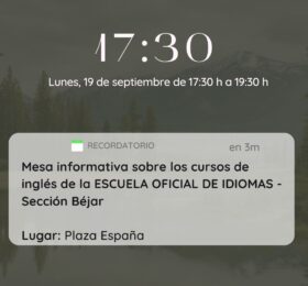 La Escuela Oficial de Idiomas, Sección Béjar, instalará el próximo día 19 de septiembre, en horario de 17,30 H. a 19,30 H., lugar...