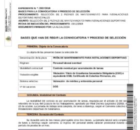 BASES QUE HAN DE REGIR LA CONVOCATORIA Y PROCESO DE SELECCIÓN PARA 2 PEONES DE MANTENIMIENTO PARA INSTALACIONES DEPORTIVAS EN RÉGIMEN...