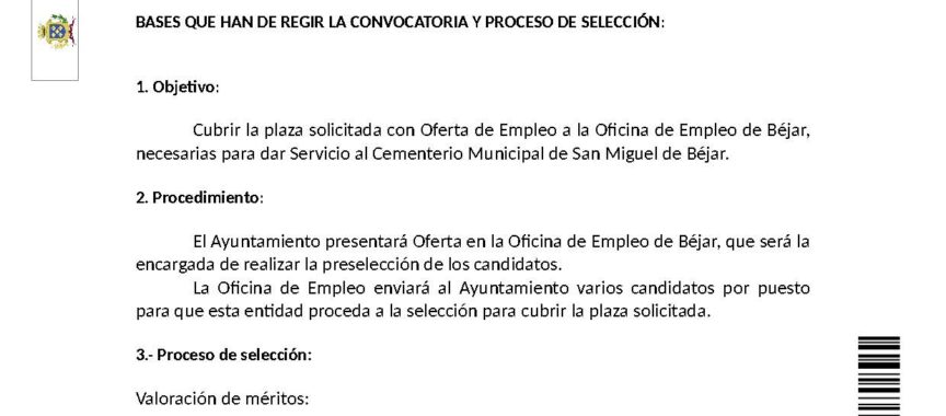 BASES QUE HAN DE REGIR LA CONVOCATORIA Y PROCESO DE SELECCIÓN para cubrir la plaza solicitada con Oferta de Empleo a la Oficina de Empleo de Béjar, necesarias para dar Servicio al Cementerio Municipal de San Miguel de Béjar.