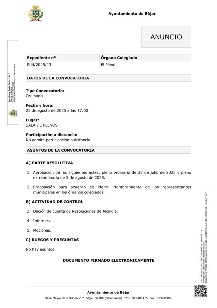 El Ayuntamiento de Béjar acogerá el pleno ordinario del mes de agosto el próximo lunes, día 25, a las 17,00 h en el Salón de plenos.