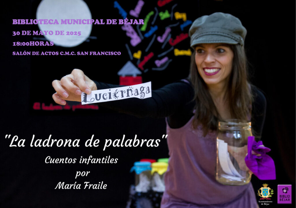 El Próximo viernes, 30 de mayo, a las 18,00h en el Salón de actos del CMC Convento de San Francisco tendrá lugar una nueva sesión del cuenta cuentos. En esta ocasión correrá a cargo de María Fraile y el titulo será “La Ladrona de Palabras”.