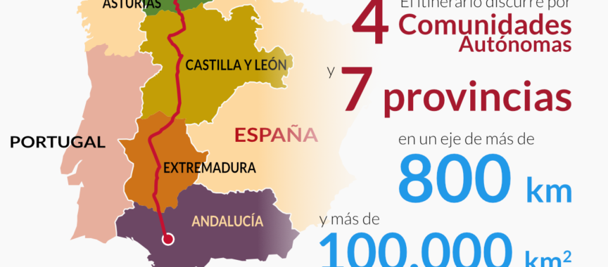 La Ruta discurre por el oeste de España atravesando 4 comunidades autónomas y 7 provincias en un eje sur-norte de casi 900 kilómetros que une la ciudad de Sevilla con la localidad de Gijón. Su recorrido, que aún conserva en algunos tramos el trazado y pavimento original de las diferentes calzadas romanas que la conforman, cuenta con importantes vestigios arqueológicos, fruto del paso de diferentes culturas a lo largo de sus 2.000 años de historia, y un importante patrimonio cultural y artístico. Este itinerario es, también, un recorrido por la gastronomía española y por la riqueza ecológica y la variedad de paisajes que se pueden encontrar en la península ibérica.