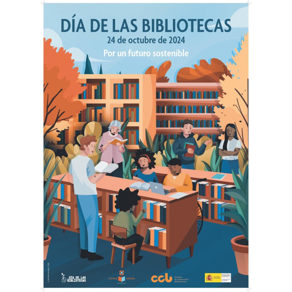 El próximo jueves, 24 de octubre, se celebra el “Día de las Bibliotecas”. Este año el lema elegido es “Por un futuro sostenible” y el cartel es obra del ilustrador Nicolás Arnárez.