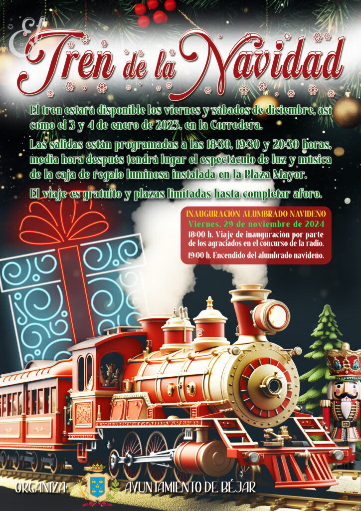Este año, como novedad, se va a habilitar el “Tren de la Navidad” para llevar a las personas que lo deseen desde La Corredera hasta la plaza Mayor para ver el espectáculo de la “Caja Navideña”. El primer viaje será este viernes y podrán disfrutar de él las personas que participen y obtengan uno de los 20 pases infantiles, en la emisora Es.radioBéjar desde hoy miércoles. Los afortunados viajarán desde La Corredera hasta la Plaza Mayor en tren y a su llegada recibirán un obsequio.