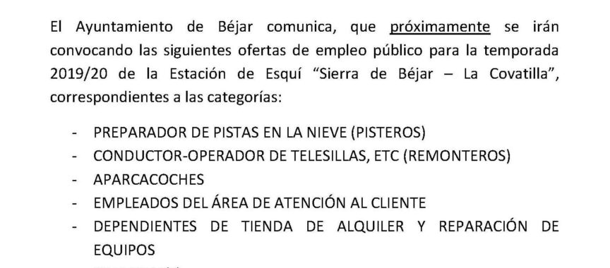 El Ayuntamiento de Béjar comunica, que próximamente se irán convocando las siguientes ofertas de empleo público para la temporada 2019/20 de la Estación de Esquí “Sierra de Béjar – La Covatilla”, correspondientes a las categorías: