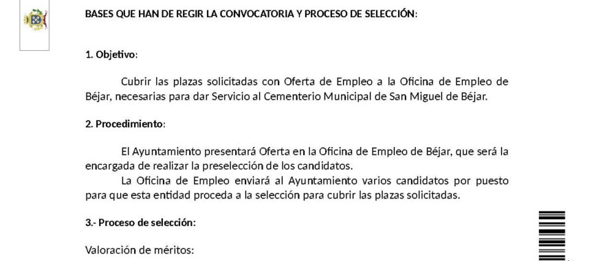 Desde el Ayuntamiento de Béjar se da a conocer las BASES QUE HAN DE REGIR LA CONVOCATORIA Y PROCESO DE SELECCIÓN para cubrir las para dar SERVICIO AL CEMENTERIO MUNICIPAL de San Miguel de Béjar.