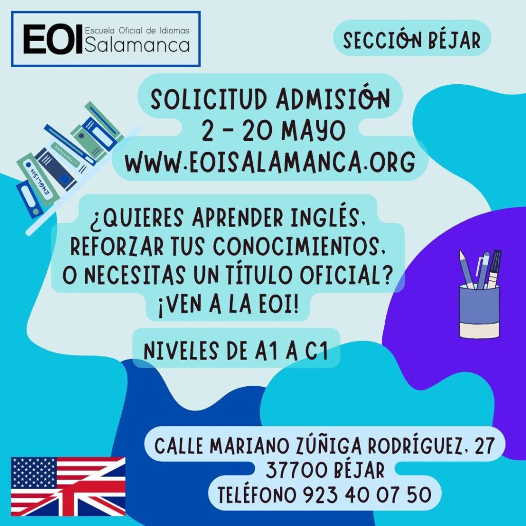 ADMISIÓN CURSO 2025/26: Desde el día 2 hasta el 20 de mayo de 2025, estará abierto el plazo de solicitud de admisión para el próximo curso en la E.O.I. de Salamanca, Sección Béjar.