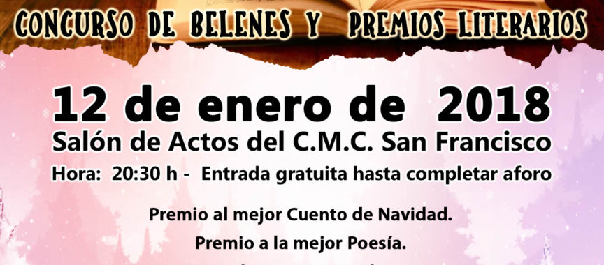 El viernes, 12 de enero, en el salón de actos del C.M.C. San Francisco a las 20:30 horas se celebrará la Gala de entrega de Premios del Concurso de Belenes y Premios Literarios.