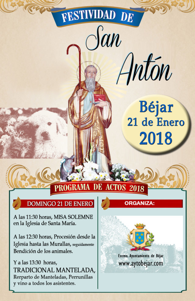 El domingo, 21 de enero, se celebra la festividad de San Antón, comenzará a las 11:30 horas la Misa Solemne en la Iglesia de Santa María, a las 12:30 horas tendrá lugar la procesión desde la Iglesia hasta las Murallas, y seguidamente comenzará la Bendición de los animales.