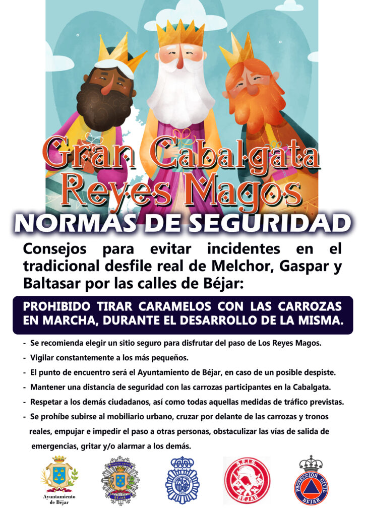 La concejalía de Festejos del Ayuntamiento de Béjar ha organizado la Cabalgata con los delegados de sus Majestades para que todo salga perfecto. Protección Civil, Bomberos y Policía Nacional y Local de Béjar, se encargarán del control del evento para que la bienvenida a los Reyes Magos se produzca sin incidentes, por lo que se solicita seguir sus recomendaciones en todo momento.