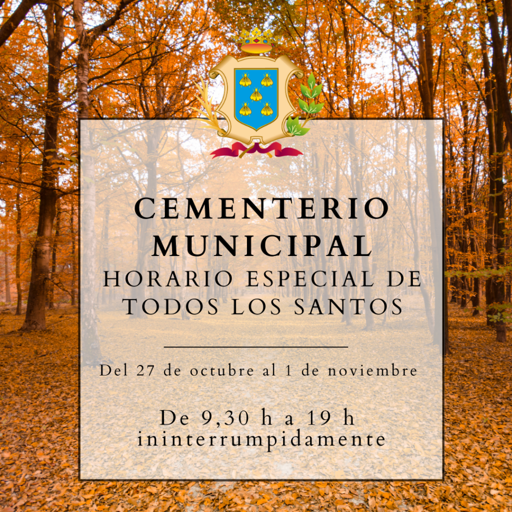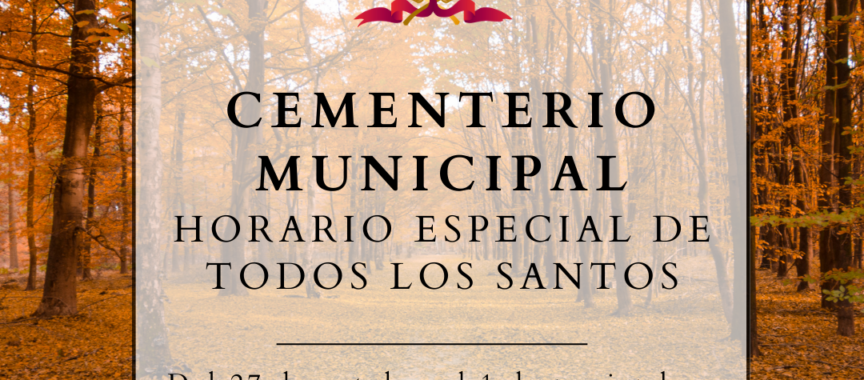 El Ayuntamiento de Béjar informa que, con motivo de la festividad de los Santos y Difuntos, el horario de apertura del cementerio municipal desde el 27 de octubre hasta el miércoles 1 de noviembre será de 9:30 h a 19:00 h en horario ininterrumpido.
