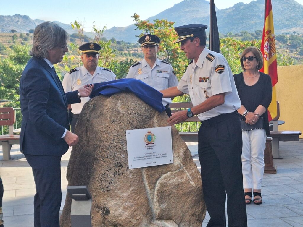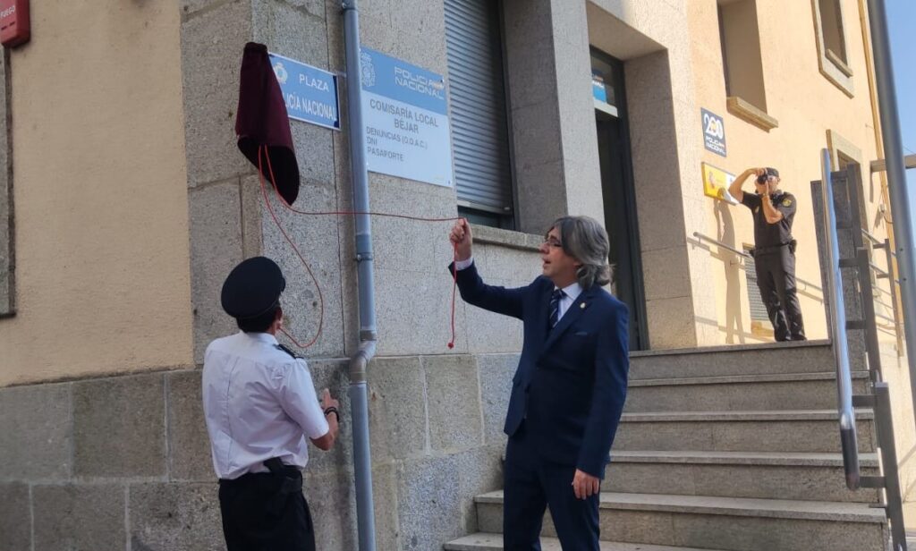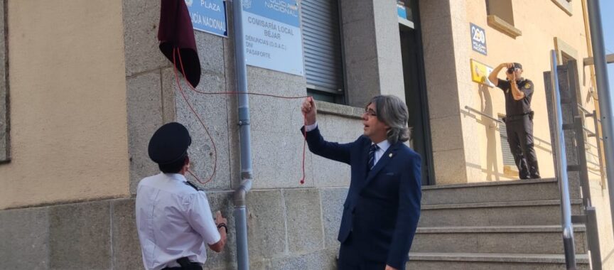 El alcalde de Béjar, Luis Francisco Martín, acompañado por varios miembros de la Corporación Municipal ha acudido a la inauguración de la Plaza en honor a la Policía Nacional en reconocimiento a sus 200 años de servicio al ciudadano. Al acto también ha acudido la subdelegada del Gobierno en Salamanca, Rosa López, así como altos cargos de la policía Nacional en la provincia de Salamanca. Este reconocimiento estaba previsto en los últimos meses del año 2024, pero fue pospuesto porque coincidió con la tragedia de la DANA.
