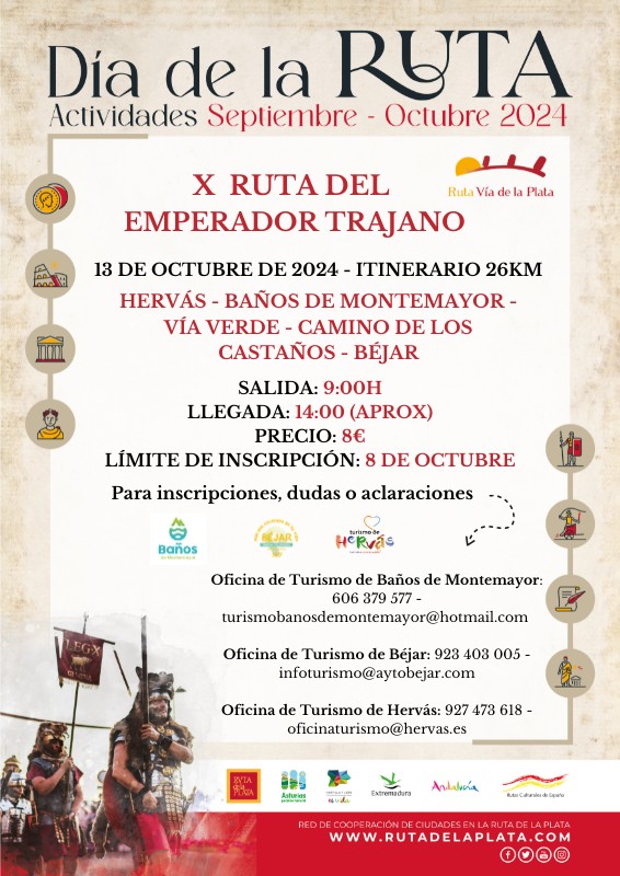 La ruta se llevará a cabo el día 13 de octubre y tendrá como salida la localidad de Hervás a las 9,00 de la mañana. Son 26 km que discurren por Hervás, Vía Verde, calzada romana hasta Baños de Montemayor y por el Camino de los Castaños hasta Béjar. La llegada está programada a las 14,00 horas.