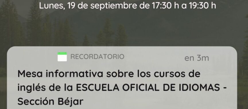 La Escuela Oficial de Idiomas, Sección Béjar, instalará el próximo día 19 de septiembre, en horario de 17,30 H. a 19,30 H., lugar Plaza de España (La Corredera) una mesa informativa donde se informará a todos los interesados sobre el estudio de inglés en la E.O.I. Sección Béjar, los niveles del Marco de Referencia Europeo, los certificados y títulos, así como de las actividades desarrolladas por nuestro centro.