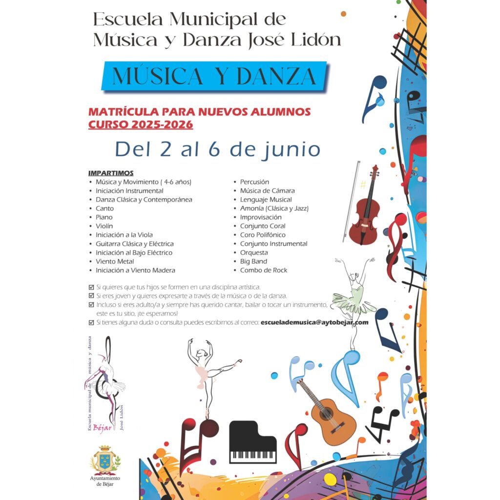 La Escuela Municipal de Música y Danza José Lidón de Béjar informa que del 2 al 6 de junio se abre el plazo de matricula para los nuevos alumnos del curso 2025/26.