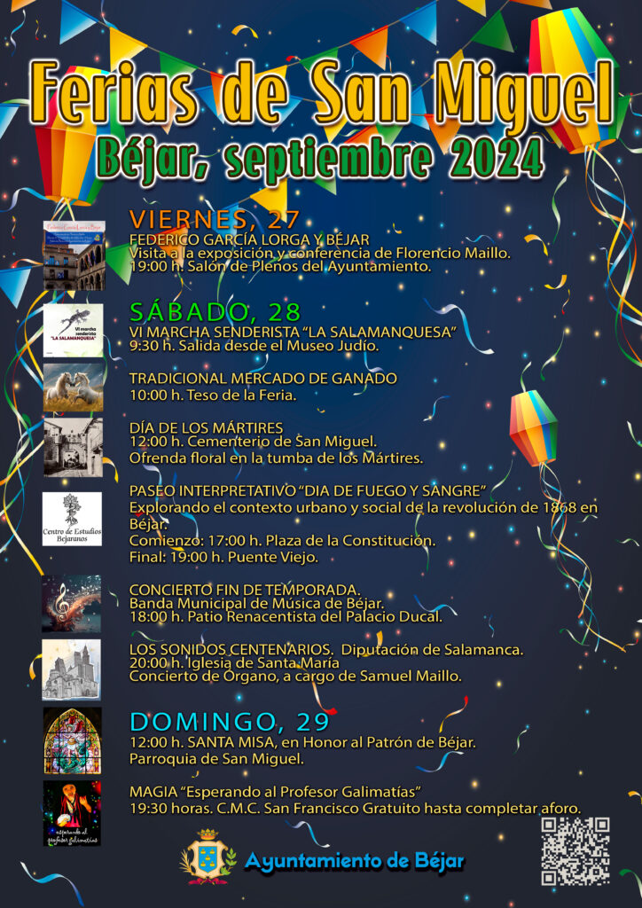 La concejala de Cultura del Ayuntamiento de Béjar, Purificación Pozo, ha informado en la mañana de hoy de las actividades organizadas para las Ferias de Septiembre en honor a San Miguel, patrón de Béjar. Estas serán las siguientes: