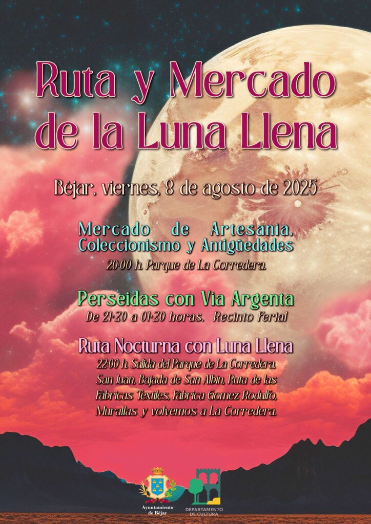 La segunda actividad es la Ruta y Mercado de la Luna Llena que tendrá lugar el 8 de agosto. A partir de las 20,00 horas las personas que lo deseen podrán disfrutar del Mercado de Antigüedades. De 21,30 a 01,30 en el Recinto Ferial, perseidas con Vía Argenta y a las 22,00 horas tendrá lugar la salida de la Ruta de la Luna Llena desde la Corredera. El recorrido será el siguiente: Corredera, San Juan, bajada de San Albín, Ruta de las Fábricas Textiles, fábrica de Gómez Rodulfo, Murallas Medievales y de vuelta a la Corredera.