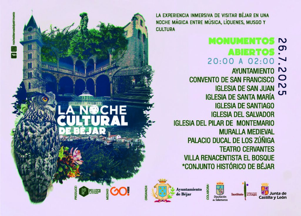 La primera de ellas es la Noche Cultural de Béjar, que tendrá lugar el próximo sábado día 26 de julio en 13 escenarios y con 19 actuaciones. Las actividades se desarrollarán con un intervalo de 15 minutos entre cada actividad desde las 19,30 que se realizarán visitas a la torre de la Iglesia de El Pilar de Montemario. Podrán subir hasta un máximo de 50 personas en grupos de 5, y cada 5 minutos, para disfrutar de las vistas. Las personas interesadas se tienen que inscribir en la primera planta del Ayuntamiento.