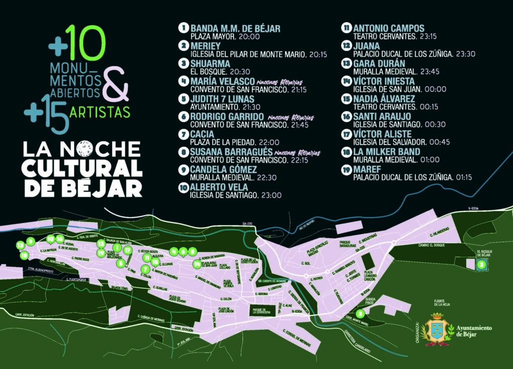 Otras instalaciones que abrirán sus puertas son el CMC Convento de San Francisco, El Bosque, el Palacio Ducal y las Iglesias de El Pilar, Santa María, El Salvador y Santiago, en ellas habrá representaciones musicales o recitales a cargo de artistas como Alberto Vela, Antonio Campos, la banda municipal de música de Béjar, Candela Gómez, Juana, Judith 7 lunas, la Milker Band, Maref, María Velasco, Meriey, Nadia Álvarez, Rodrigo Garrido, Santi Araujo, Shuarma, Susana Barragués, Víctor Aliste y Víctor Iniesta. Las actividades se extenderán hasta las dos de la madrugada y son gratuitas.