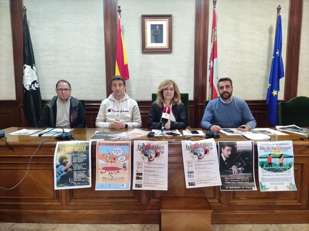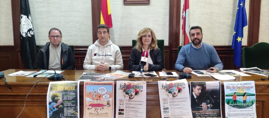 La concejala de Cultura y Turismo, Purificación Pozo, el concejal de Festejos, Javier Hernández Carrión, el concejal de Deportes, Rubén Martín y el presidente del Grupo Bejarano de Montaña, Pedro López presentaron, en la mañana de ayer, la programación de las Ferias de mayo 2024.