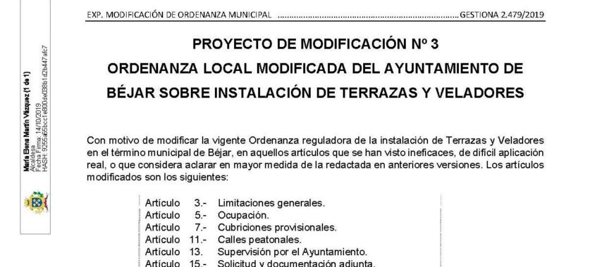 Con motivo de modificar la vigente Ordenanza reguladora de la instalación de Terrazas y Veladores en el término municipal de Béjar, en aquellos artículos que se han visto ineficaces, de difícil aplicación real, o que considera aclarar en mayor medida de la redactada en anteriores versiones.