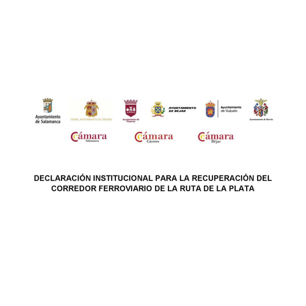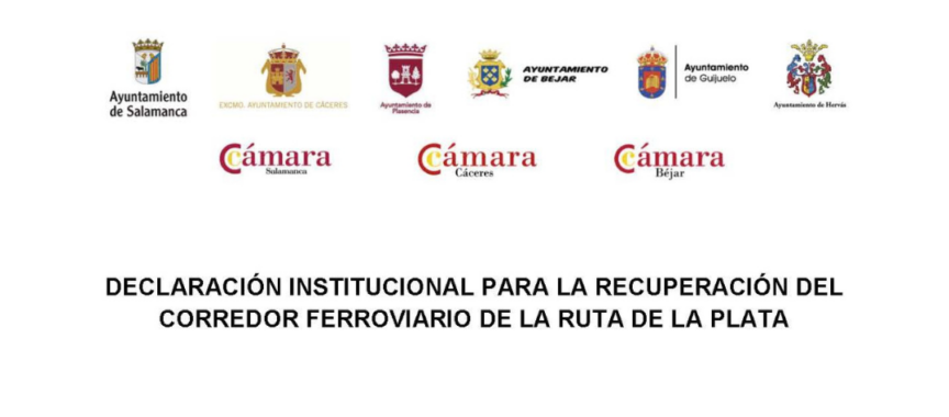 Los ayuntamientos de Salamanca, Cáceres, Plasencia, Béjar, Guijuelo y Hervás y las cámaras de Comercio de Salamanca, Cáceres y Béjar han firmado hoy una declaración institucional para reivindicar la recuperación del corredor ferroviario de la Ruta de la Plata. El objetivo es que permanezca en la Red Básica Ampliada de la Red Transeuropea de Transporte y cuente lo antes posible con dotación presupuestaria para que esté operativa en el horizonte temporal de 2040.
