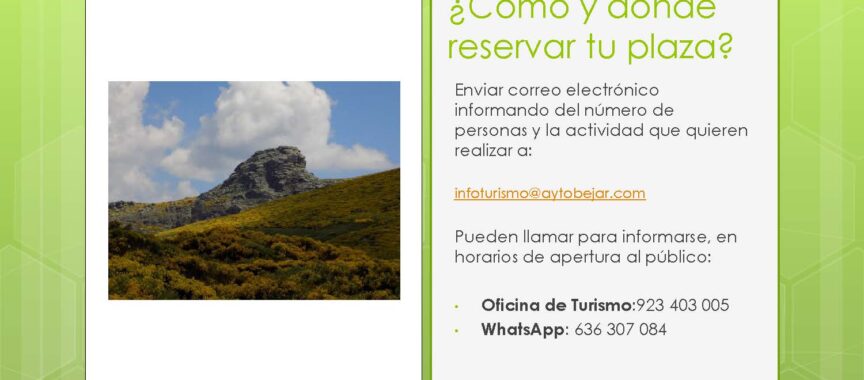 Para más información y reservas de plaza, puedes hacerlo a través del correo electrónico informando del número de personas y la actividad que se quiere realizar a infoturismo@aytobejar.com o por teléfono a la Oficina de Turismo al 923 403 005 o escribiendo un WhatsApp al 636 307 084.