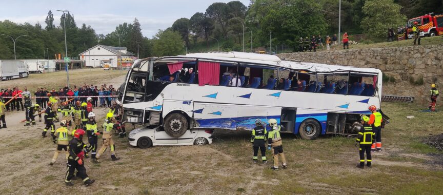 El recinto Ferial de Béjar ha acogido, en la mañana de hoy la última actividad de las Jornadas Internacionales de Bomberos 2024. Se trata de un SIMULACRO con varios escenarios. Por una parte, un autobús siniestrado con victimas en su interior y un coche debajo con ocupantes. Unos metros más arriba, otro grupo de bomberos han hecho una práctica de sacar a dos personas de un depósito de agua que habían caído y una de ellas tenía una fractura y no podía salir por su propio pie. En otra zona del recinto ferial se ha simulado un choque de vehículos, en el que se ha visto implicado un camión que portaba mercancías peligrosas, otro con aminales vivos y un tercero con colmenas. Y finalmente, en la zona del rio había un rescate de una víctima de un accidente.